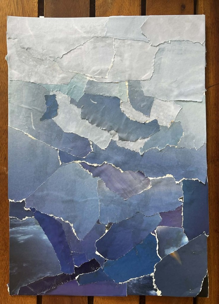 Reflection: This artwork was created by recycling old magazines. The pieces used were intentionally ripped up to create raw edges, giving the illusion of movement within the water. As the water gets deeper the intensity of the collage increased to signify the deeper currents. While not photographed well, the magazine pages used to create the top layers of the ocean were chosen as they have white streaks through them creating the illusion of light reflecting on the water surface.