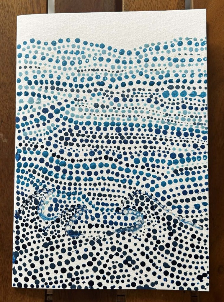 Reflection: I found this dot painting incredibly challenging to create and a test of my patience. I tried to use a variety of dot sizes, similarly to what I observed in the ‘Kapi Piti Waterhole’ artwork by Andrew Tjupurrula Highfold. The artwork was created based of my initial line drawing sketch. I feel as though the artwork could have been improved by using better equipment, so that dots could have been uniformly circular. While the colours created the gradient I pictured in my head, I felt on reflection that the currents under the water could have been improved through the addition of a larger variety of colours (i.e. dark green, purples and maybe some lighter colours for depth and illusion).