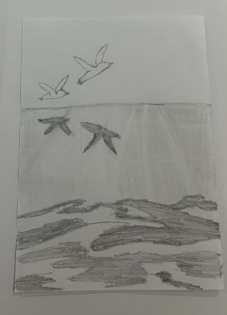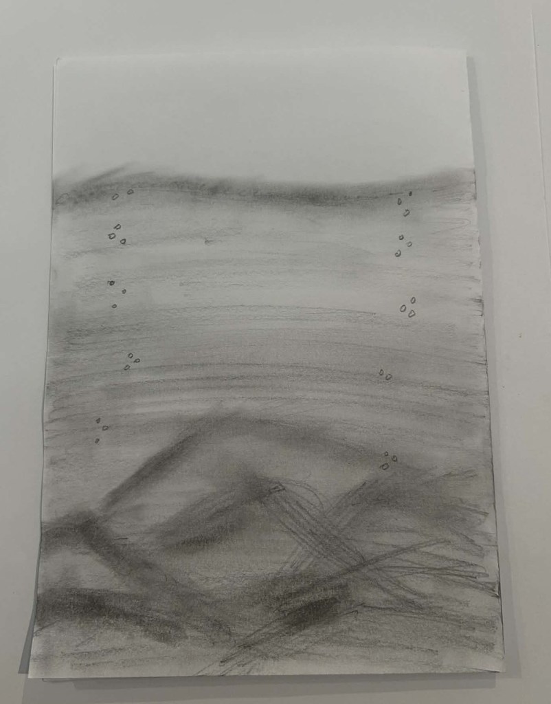 Drawing Three: In my third drawing I focused on combining line work and shading to create both depth and the illusion of reflection in the water. When viewing the final product, my initial thoughts are that the underwater currents look more like coral and that the artwork could have benefited from some of the smudging techniques utilised in drawing two. I felt the use of the shading and eraser to create the illusion of sunlight entering the water was surprisingly effective and likely a technique I would use again.