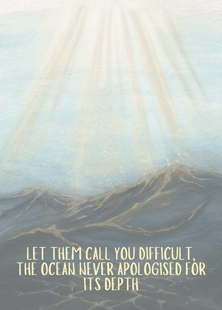 My Identity: I am not the stormy chaotic ocean but more like the vast, steady sea. Most of the time I am calm, consistent and have strong reflective qualities. I am not often moveable, but also not passive and when triggered can be reactionary. Like the ocean though if you dive deeper beneath the surface, I have a current of deep emotions and thoughts that are constantly at play swirling where they can’t be seen.